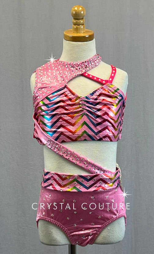 Light Pink Asymmetrical Connected Two PIece with Rainbow Chevron - Rhinestones