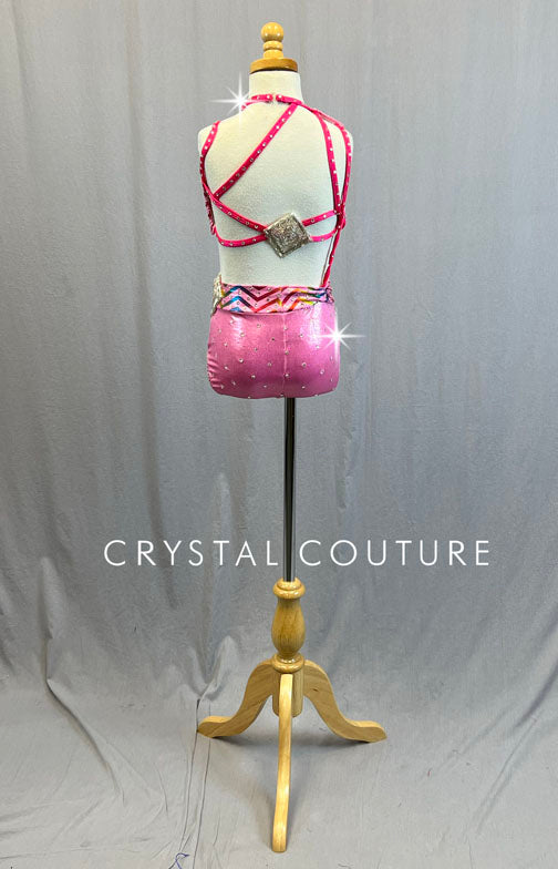 Light Pink asymmetrical two piece has strappy back and connects to trunks. Top and waistband are patterned with Rainbow chevron. 3 Gross of Crystal 20ss Rhinestones!