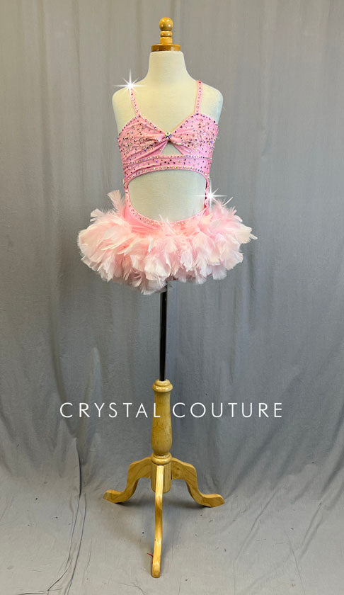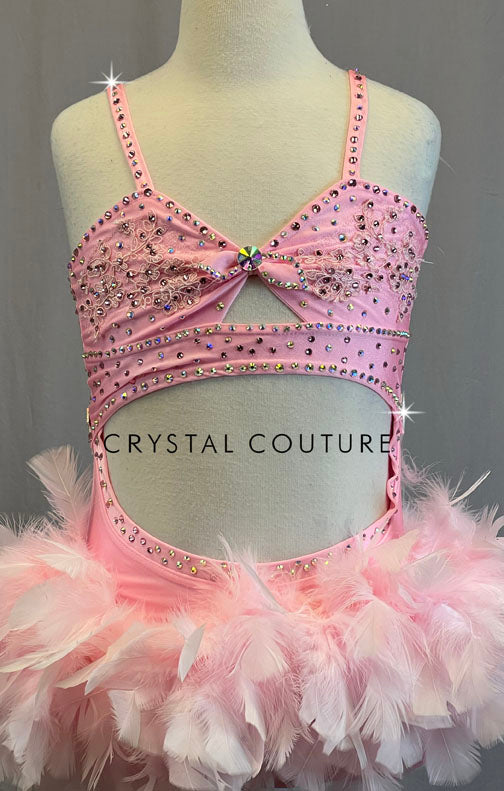 Custom Light Pink Leotard with Cutouts and Feather Skirt - Rhinestones