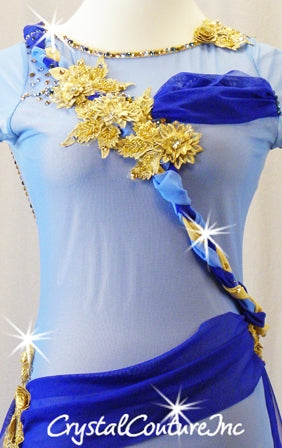 Custom made Lt Blue sheer mesh leotard with Nude Lycra line. Costume has short sleeves, low open back, Lt Blue/Nude/Navy draping and braid. Embellished with Gold embroidered floral/beaded/sequin 3D appliques and rhinestones!
