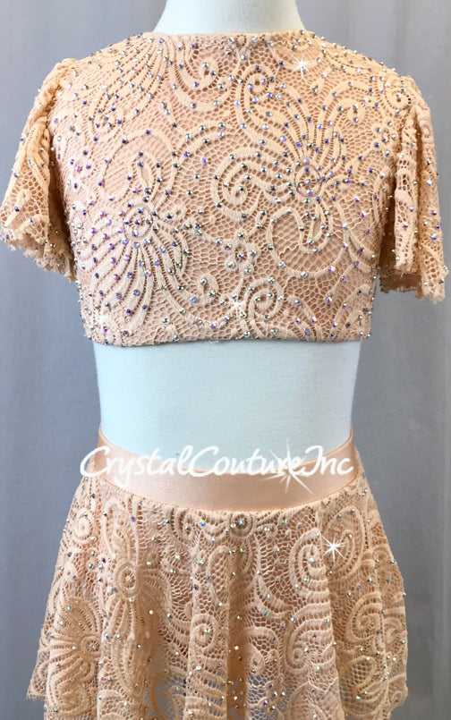 Light Peach custom made 2 piece open net lace over Lt Peach lycra top and trunk. Top has flutter sleeves and open back. Paired with soft flirty skirt. Costume is decorated with Swarovski rhinestones!