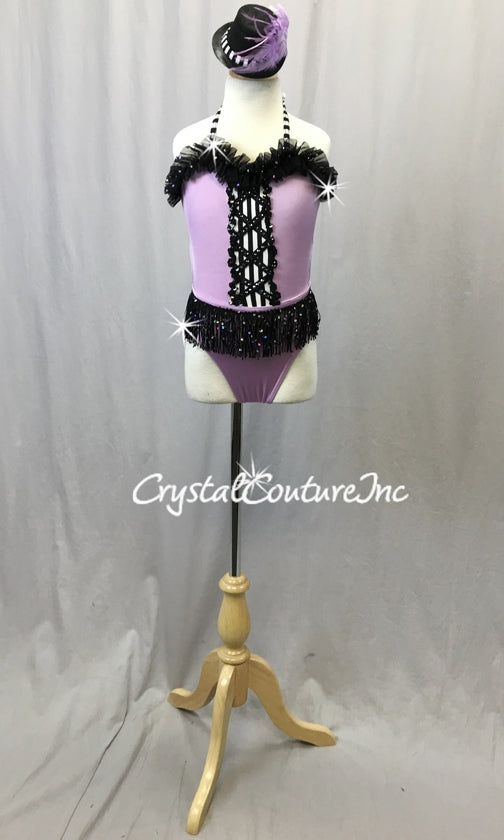 Parisian inspired Lt Purple custom made halter leotard with Black/White stripe inset. Costume is accented with Black sheer mesh ruffle and Black chainette fringe with iridescent sequins and Swarovski rhinestones!