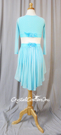 * Seamstress Sample - BRAND NEW custom made Lt Turquoise Blue lycra and dotted sheer mesh long sleeve top with booty shorts. Costume has a matching dotted sheer back half skirt and Lt Turquoise 3D flower and feather accents.