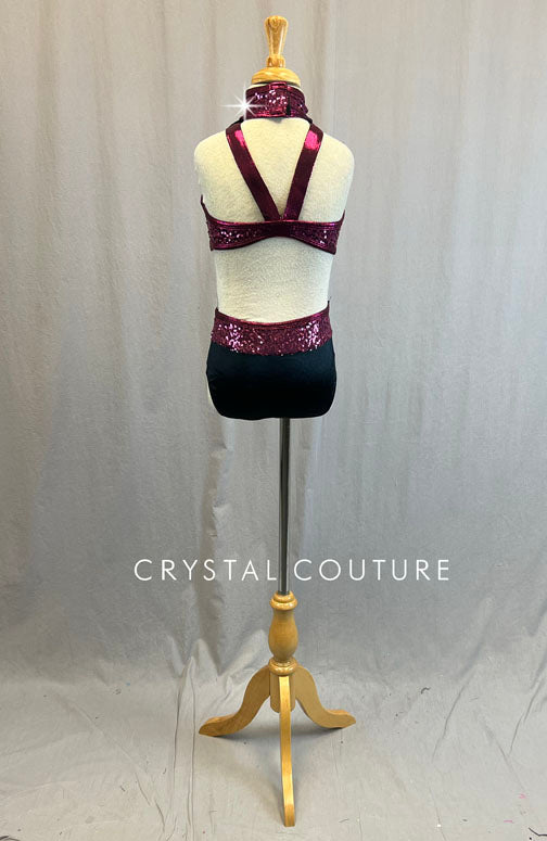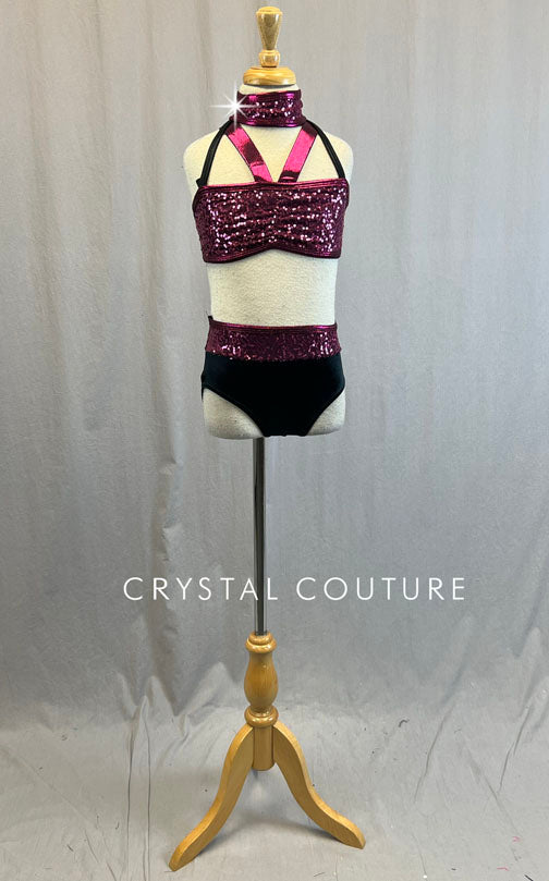 Magenta zsa zsa top has choker collar and multiple connecting straps. Black trunks have zsa zsa waistband.