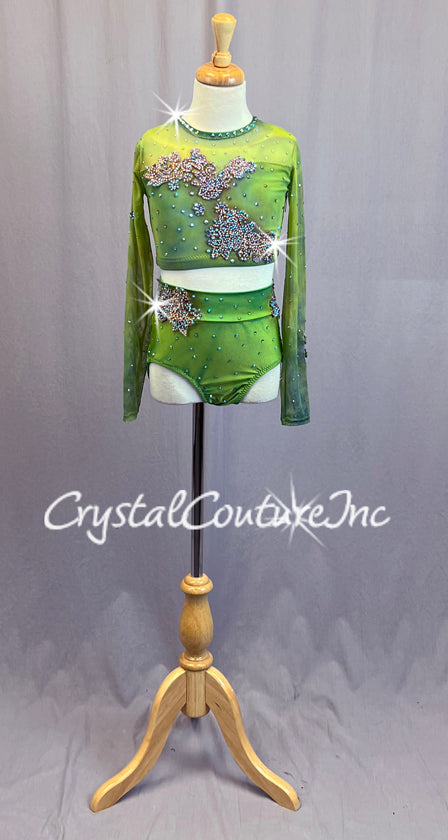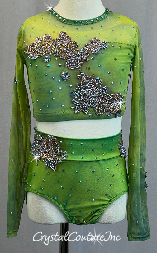 Custom Marble Green Lycra Top & Trunks with Long Mesh Sleeves - Rhinestones & Appliques