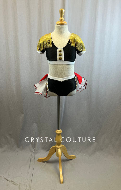 Marching band inspired 2-piece with black cap sleeve bra top with white trim, gold buttons, and gold epaulets detailing. Black brief has a white tulle half skirt lined with red sequin trim and gold buttons on front.