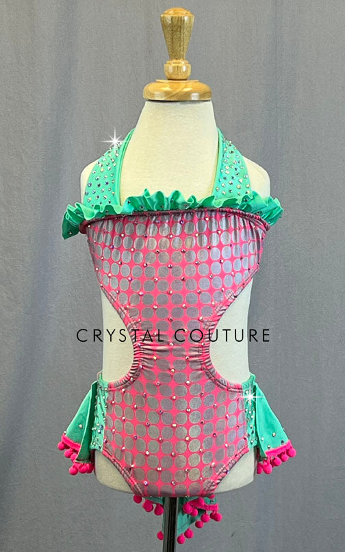 Mint Lycra and Hot Pink and Silver Polka Dot Halter Leotard with Ruffles- Rhinestones