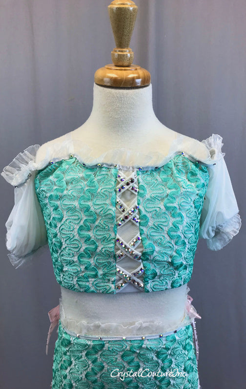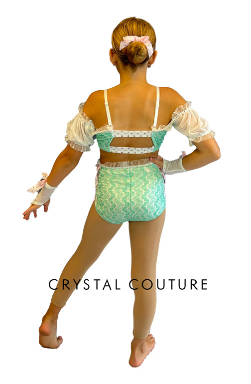 Adorable two piece mint green lace top and trunks with attached mesh off shoulder arm bands. Decorated with Pastel Pink bows on the hips and rhinestones.