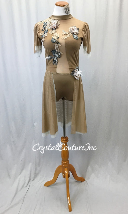 Mocha Brown custom made mesh biketard has a mock neck with low, open keyhole back. Bodice has a dramatic mesh inset down the center and delicate short flutter sleeves. Flutter sleeves and half skirt are layer Mocha and Grey mesh. 3-D appliques in shades of Silver, Bronze and Blue and Swarovski rhinestones accent this costume.