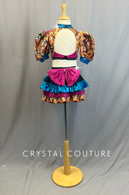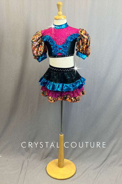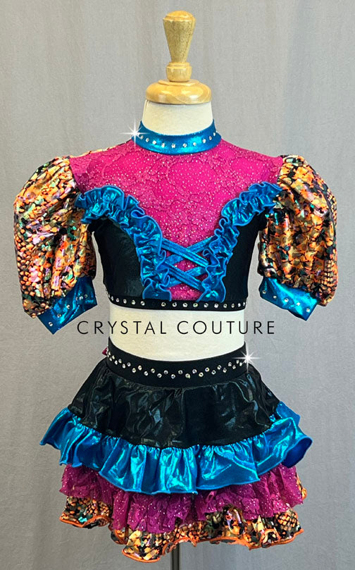 Multi colored patterned lycra includes Orange, Turquoise Blue and Fuchsia. Multi colored fabric creates puffy sleeves and bottom ruffle of skirt with Blue shiny lycra ruffle accents on top as well as ruffle on the skirt. Pink glitter lace ruffle on the skirt as well as neckline and chest of crop top. Black shiny lycra pulls it all together with crystal 20ss rhinestones to trim top and belt of skirt.