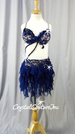 Beautiful Navy Blue custom solo costume! Nude bra top is covered with Navy Blue floral lace. Tendril sheer mesh skirt has attached Navy Blue lycra booty shorts and a waistband made of Navy Blue floral lace over Nude lycra. Extensive use of beaded/sequined appliques and Swarovski rhinestones add intricate detail to this stunning one-of-a-kind costume!