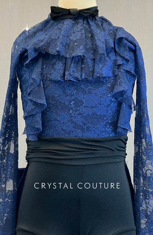 Navy long sleeve lace top has ruffle bib and attached Black lycra booty shorts. Back has keyhole opening and coat tail back with large bow. 1 Gross of Deep Indigo 16ss and Jet Hematite 16ss Rhinestones!