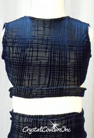 Navy Blue patterned velour sheer 2 piece crop top and high-waist booty shorts lined with Nude lycra. Top has 4 back button and separate strap.