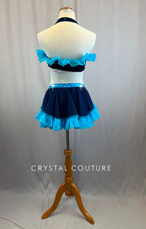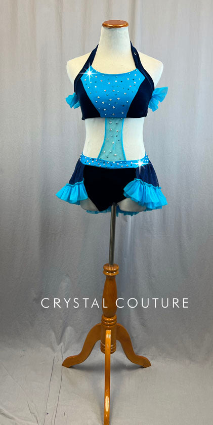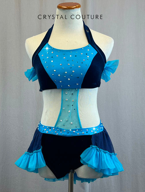 Navy Blue velvet halter crop top with Turquoise lycra inset and ruffle. Skirt features a built in Velvet brief and open front look. Turquoise mesh ruffle drapes in 2 layers of Navy mesh skirt. Over a gross of Crystal AB 30ss and Sapphire AB 20ss rhinestones are sprinkled on Turquoise lycra of top and waistband of skirt.