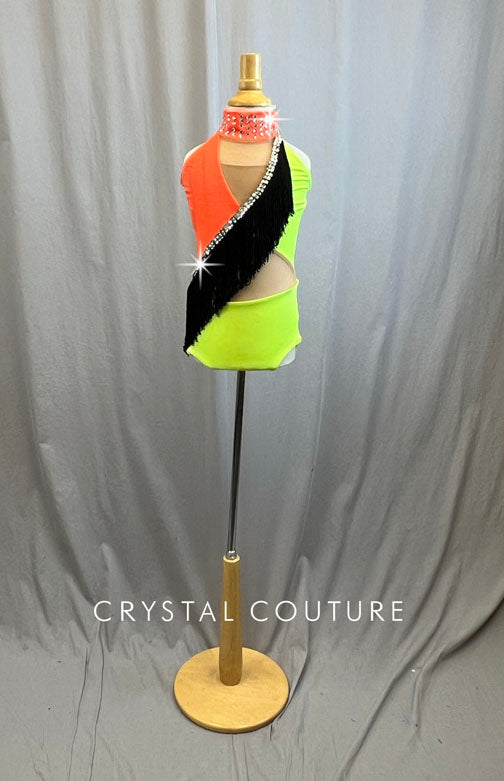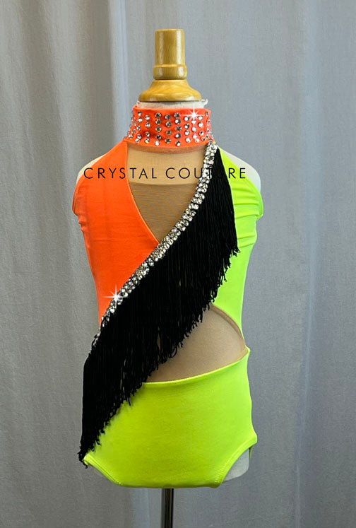 Neon Orange and Yellow Mock Neck Leotard with Black Fringe Accent -Rhinestones
