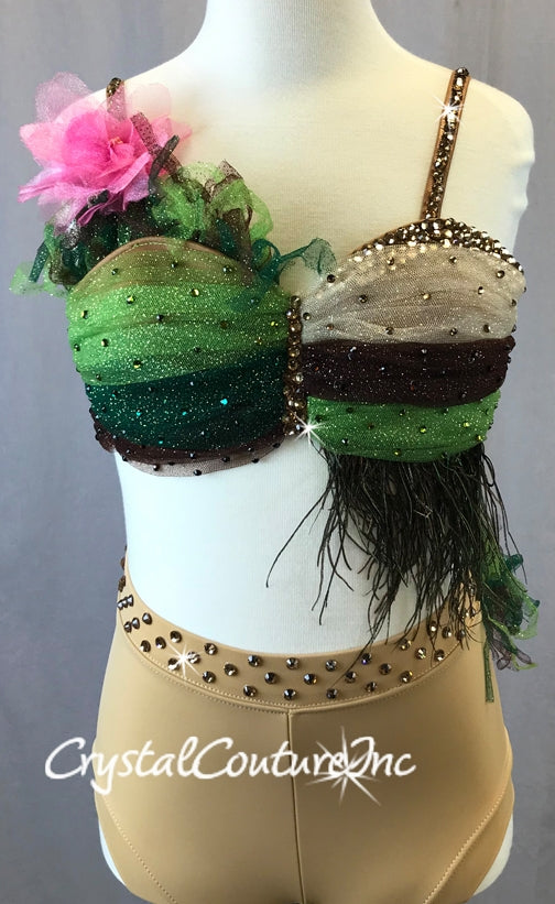 Nude, Brown and Green Tulle Bra-Top with Trunks - Swarovski Rhinestones