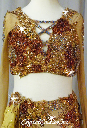 Nude custom-made 2 piece long sleeve sheer mesh top paired with Nude lycra booty shorts and Gold chiffon 2 tier half skirt. Costume is covered with a combination of Gold embroidered 3D beaded, sequin, pearl appliques, Copper beaded sheer mesh appliques and Gold metallic flowers. The intricate use of embroidered fabric, appliques and TONS of Swarovski rhinestones makes this costume simply AMAZING!!!