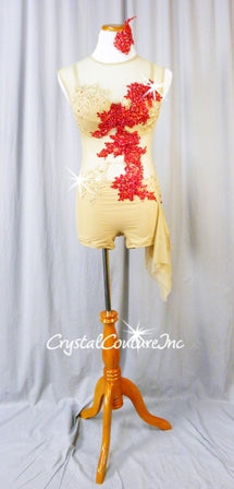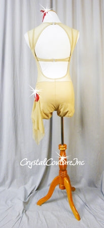 Nude sheer mesh custom made biketard with built in Nude lycra bra-top and brief. Costume has a sheer neckline, low open back and side tendril skirt. Decorated with stunning Ivory embroidered/beaded/pearl appliques, Red embroidered beaded/sequin appliques and Swarovski rhinestones!