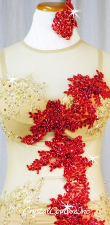Nude Sheer Mesh & Lycra Biketard - Ivory & Red Beaded Appliques & Swarovski Rhinestones