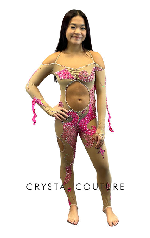 Custom Nude Sheer Mesh with Hot Pink Unitard with Cut-Outs - Swarovski Rhinestones