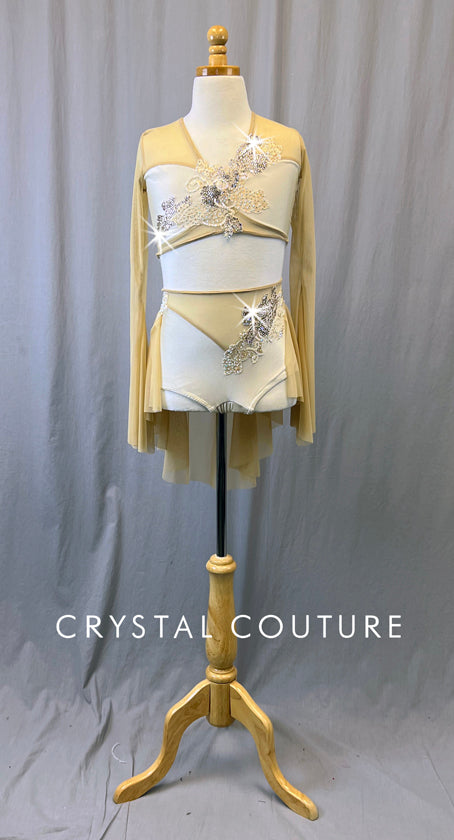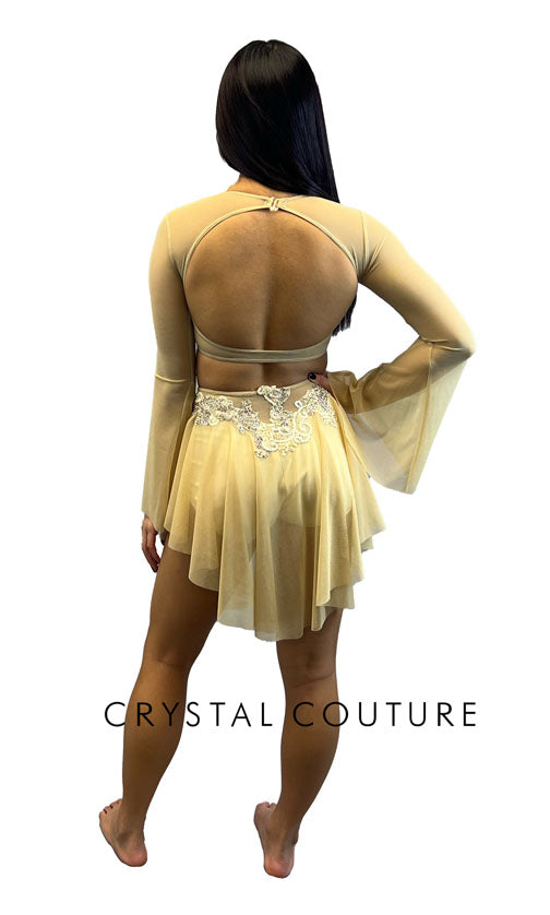 Nude Two Piece with Flutter Sleeves & Half Skirt - Rhinestones