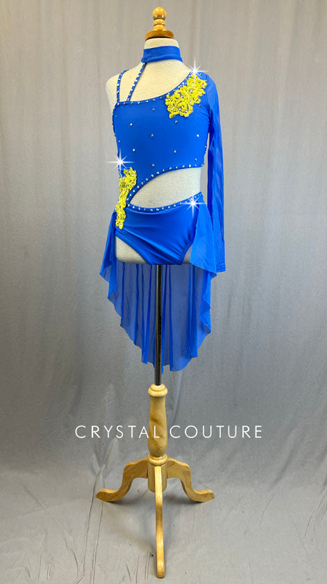 Ocean Blue leotard has long mesh sleeve on left arm and cut out on left side of torso. Strappy back and shoulder details with attached choker collar. Mesh high low back skirt attached at waist. Bright Yellow beaded appliques on front of left shoulder and side of right hip.