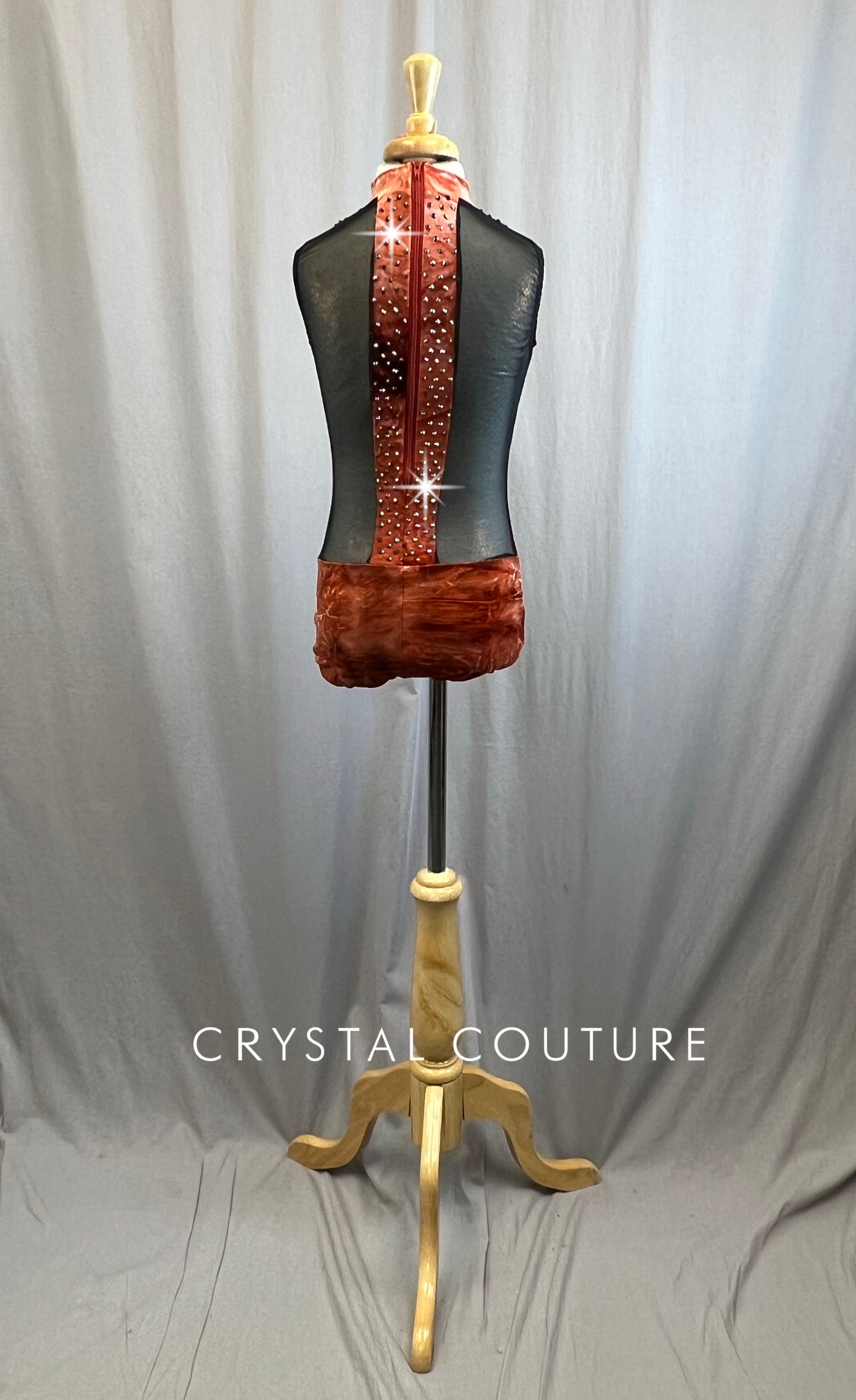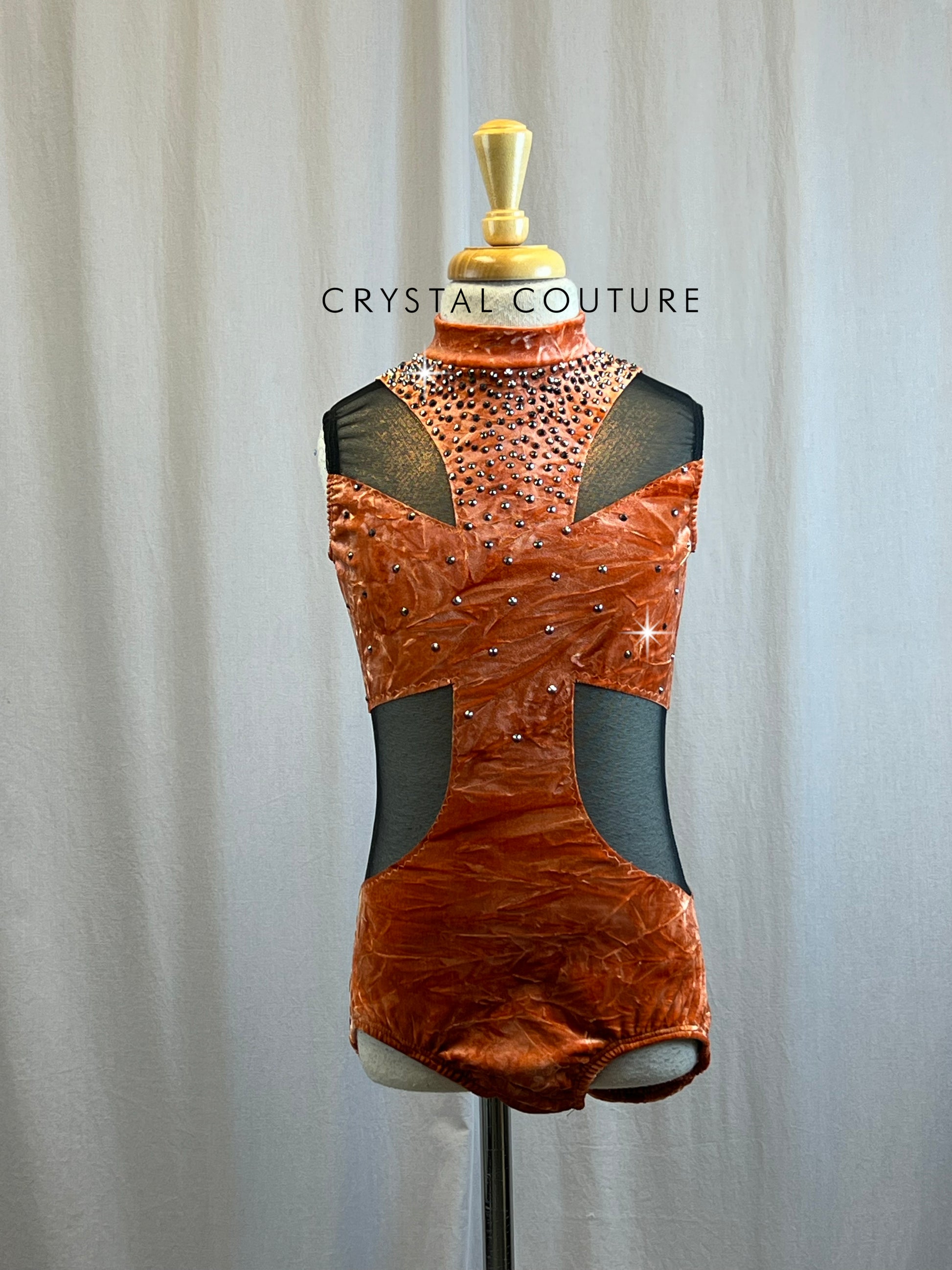 Orange Crushed velvet high neck leotard, with Black metallic mesh cutouts. Zipper closure in back. Accented with 3 gross Crystal Light Chrome 20ss and16ss.