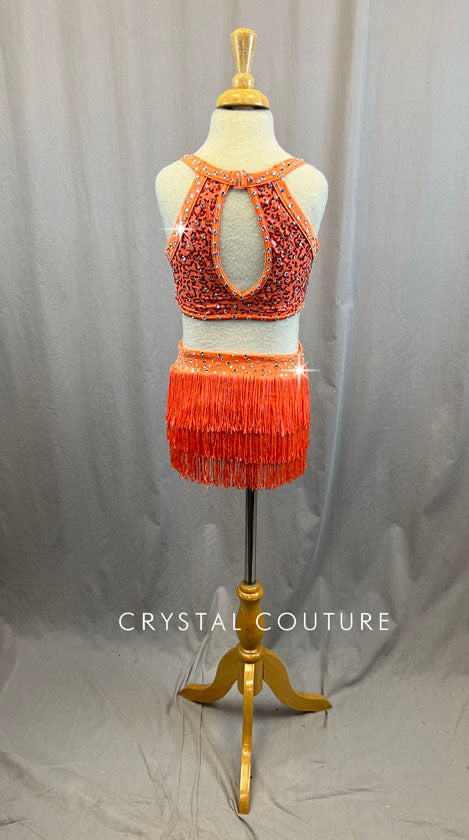 Orange zsa zsa leotard with fringe on bust and brief. Accented with Crystal belt buckles and 2 gross of Crystal rhinestones.