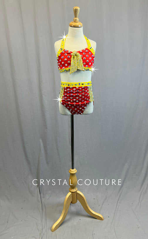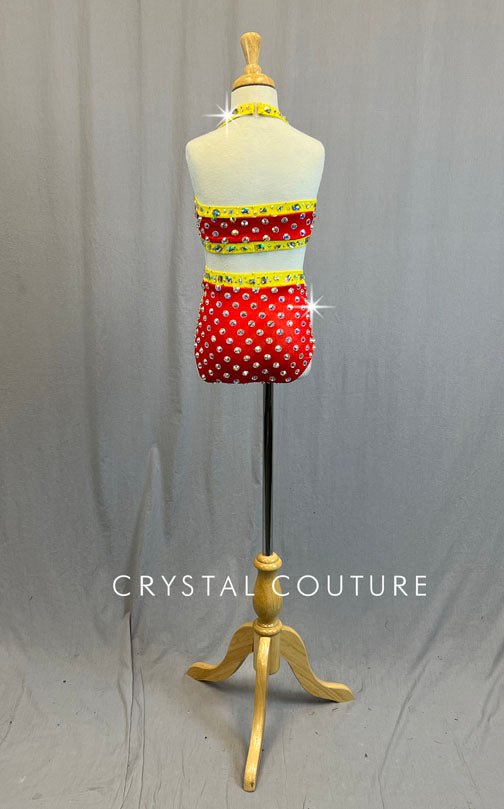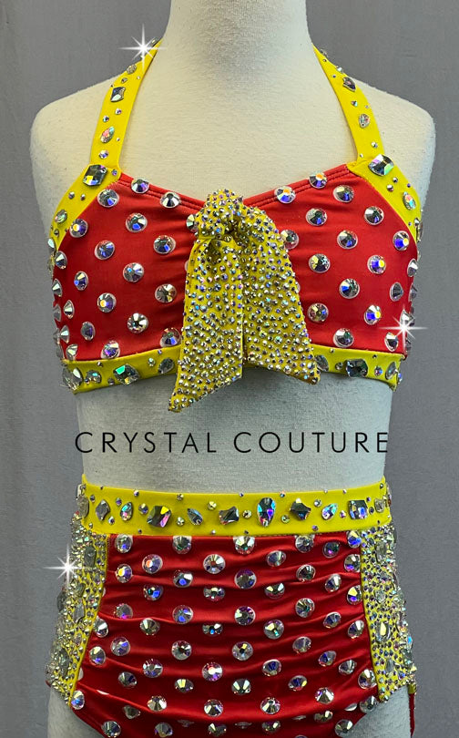 Custom Orange polka dot halter top has Yellow straps and edging with tie on front. High waisted trunks are Orange polka dot with Yellow waistband and side stripes. Trunks are ruched. 12 Gross of Crystal AB 9ss, 12ss, 16ss, 20ss, 30ss, 48ss, and Shaped Rhinestones!