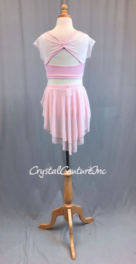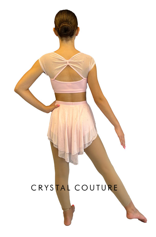Pastel Pink Two Piece with Mesh Cap Sleeves and High Low Skirt - Rhinestones and Floral Appliques