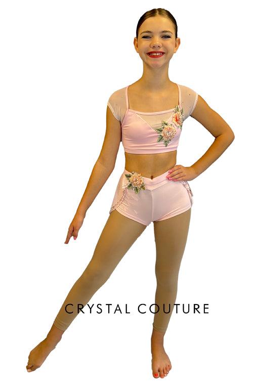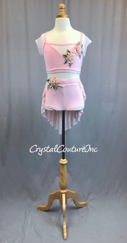 Pastel Pink cap sleeve top with sweetheart neckline. Double layer high-low half skirt attached to lycra short. Finished with 3D Peach floral appliqués and a scattering of rhinestones.