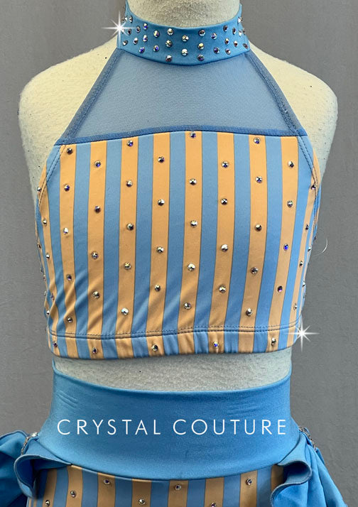 Peach & Blue Striped Two Piece with Ruffle Back Skirt - Rhinestones
