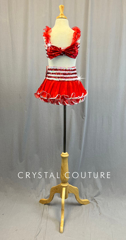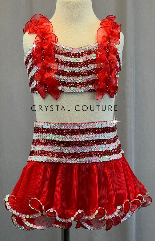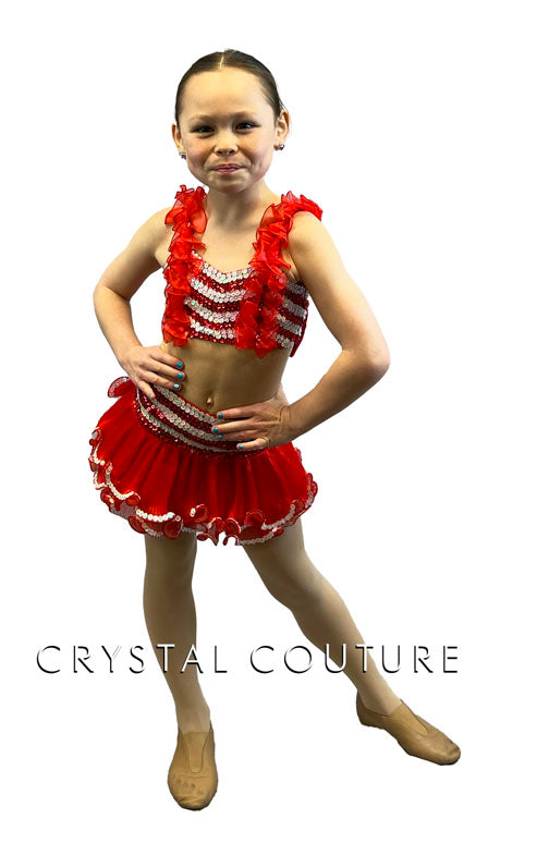 Red and White striped top is fully sequined with Red ruffle straps. Skirt is a two layer Red ribbed chiffon with ruffled edges. Waistband is Red and White striped sequins.