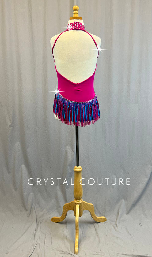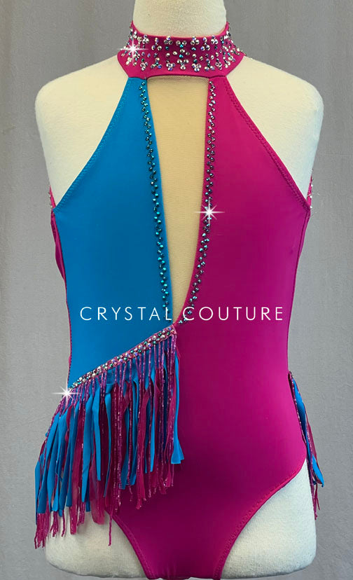 Custom mock neck open back leotard is Magenta with Bright Blue on right side of torso. Nude V shaped insert on front of torso. Asymmetrical beaded and fabric fringe skirt is attached.
