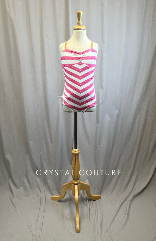 Pink and white chevron lycra double lined swimsuit with nude spaghetti straps and sweetheart neckline. A few dozen 30ss Fuchsia AB rhinestones are scattered for sparkle. Inspired by Barbies iconic classic swimsuit.