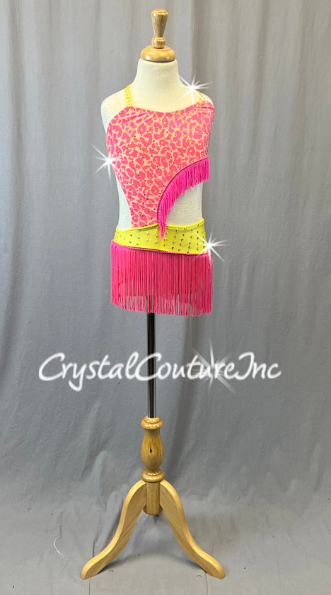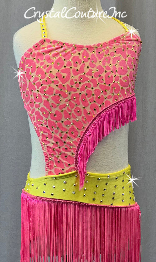 Pink & Yellow Animal Print Connected Two Piece with Fringe - Rhinestones