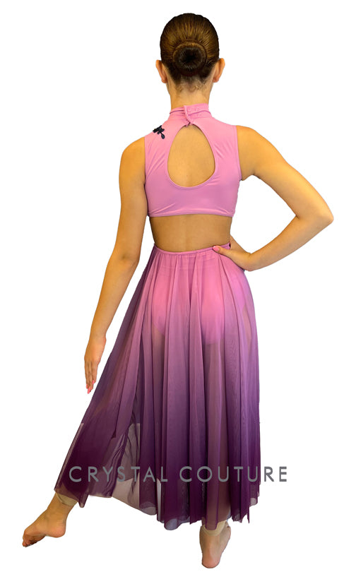 Pink Mock Neck Leotard with Attached Long Ombre Skirt and Appliques