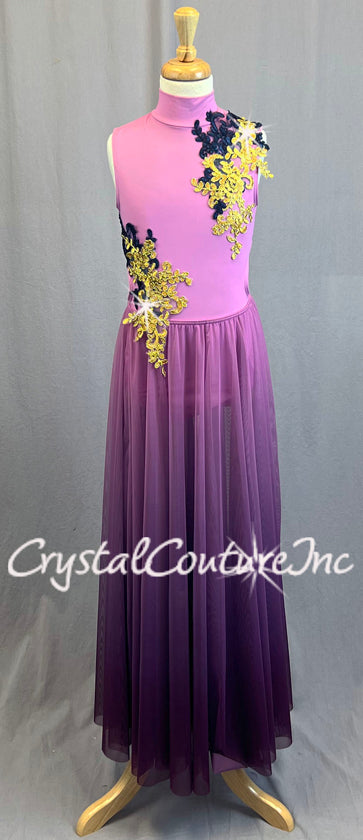 Pink mock neck lycra leotard with snap closure and hand sewn Navy Blue and Gold appliqués. Upper back has cutout and low back is open. Attached sheer skirt is long and transitions from Pink to Deep Purple at the bottom.