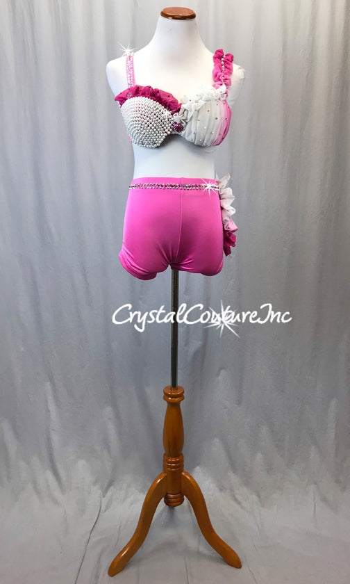 Pink and White 2 piece bra-top and booth short. Top is ombre White to Pink pleated sheer mesh, faux pearls and Pink ruffles. Paired with Pink lycra high-waist booty shorts with ombre mesh side ruffle. Costume is accented with Swarovski rhinestones and pearls.