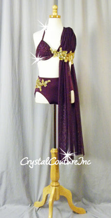 Plum 2 piece bra-top with matching briefs. Halter top has a Plum sheer mesh draping from one shoulder, creating the look of a skirt. Costume is decorated with Gold beaded/sequin appliques and Swarovski rhinestones!