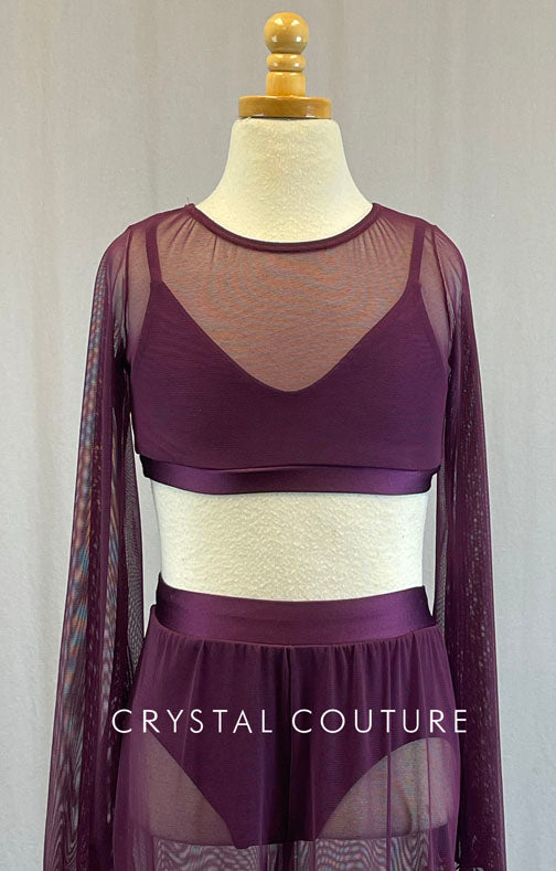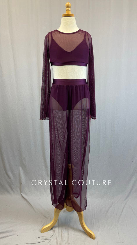 Plum flare sleeve mesh top has attached bra top. Paired with wide leg mesh pants and attached trunks.