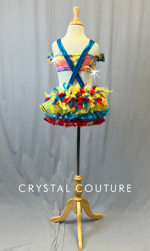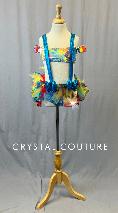 Primary Colored Two Piece with Feather Back Bustle & Suspenders - Rhinestones
