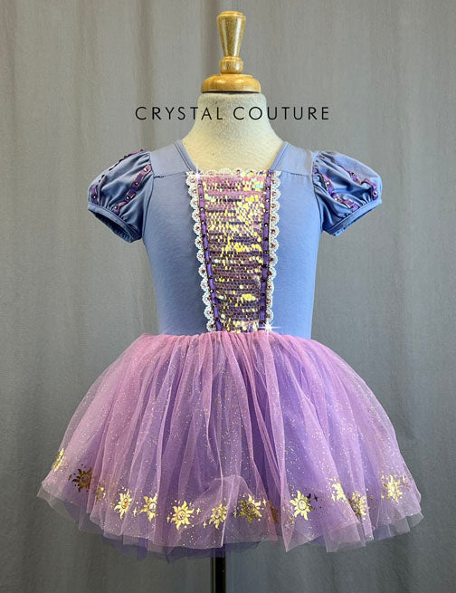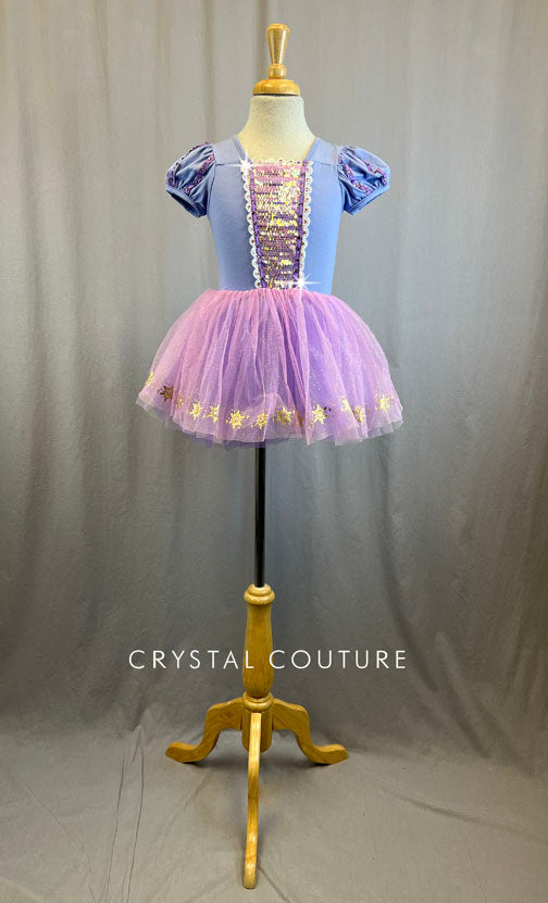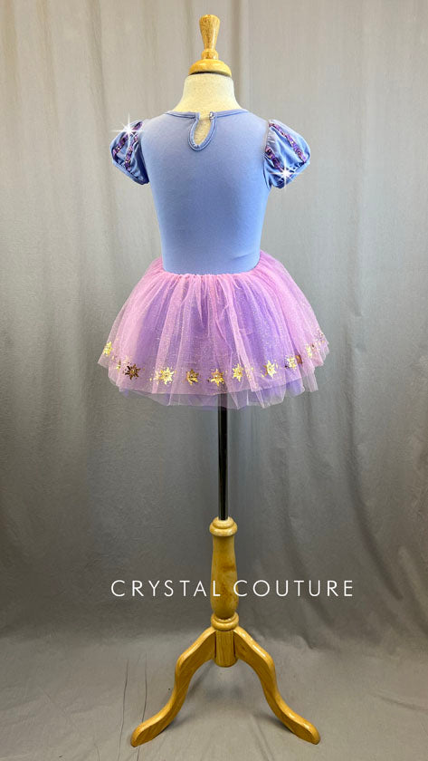 Cotton Princess dress with satin and tulle skirt. Snap crotch leotard for pull over bodice. Rhinestone details in coordinating colors for a perfect stage look!