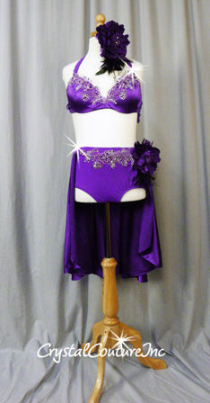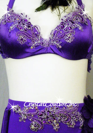 Purple custom-made 2 piece halter bra-top and briefs with shiny lycra satin back skirt. Costume is accented with Purple floral/Silver corded appliques, a large flower/feathers and rhinestones!
