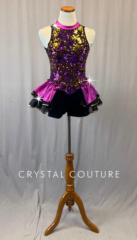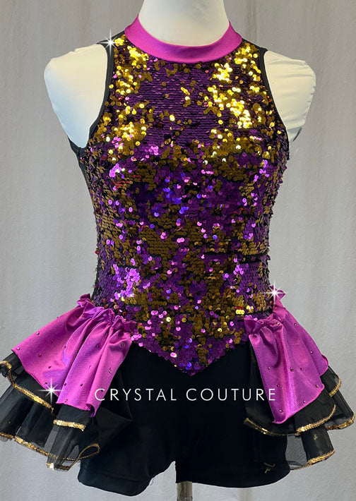 Purple and Gold Sequined Unitard with Half Skirt - Rhinestones