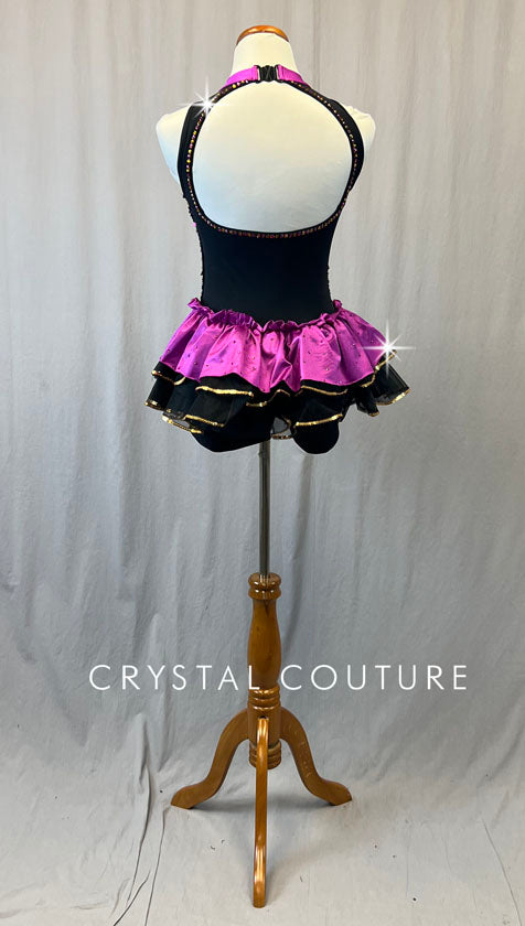 Purple and gold sequined unitard with half skirt, high neck and open back. Accented with a gross of Ruby and Topaz rhinestones.