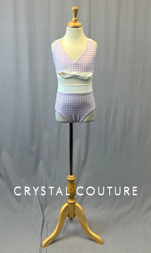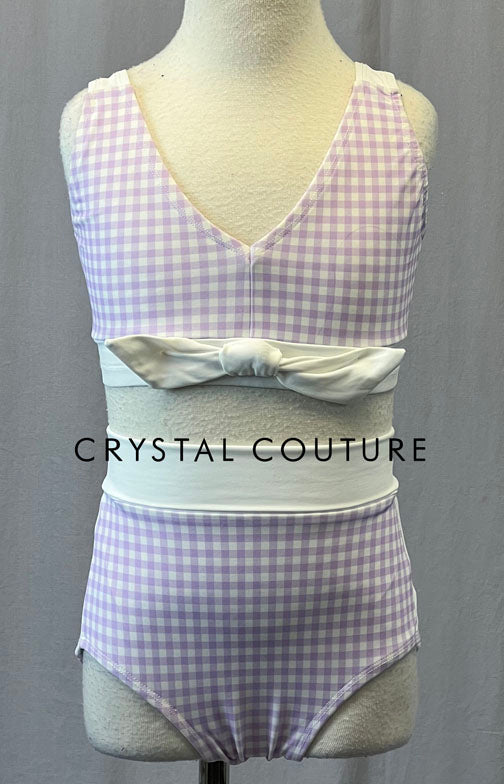 Purple and White gingham top has V neck with wide straps and White knot tied on front. Trunks are high waisted with White waistband and side panels.