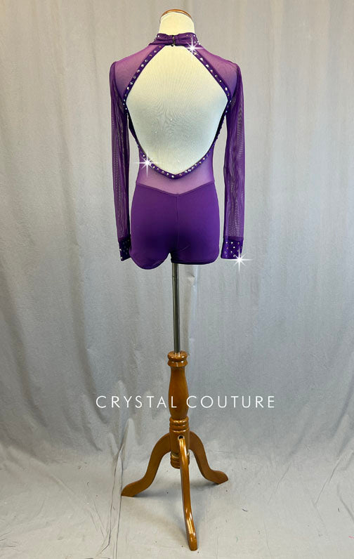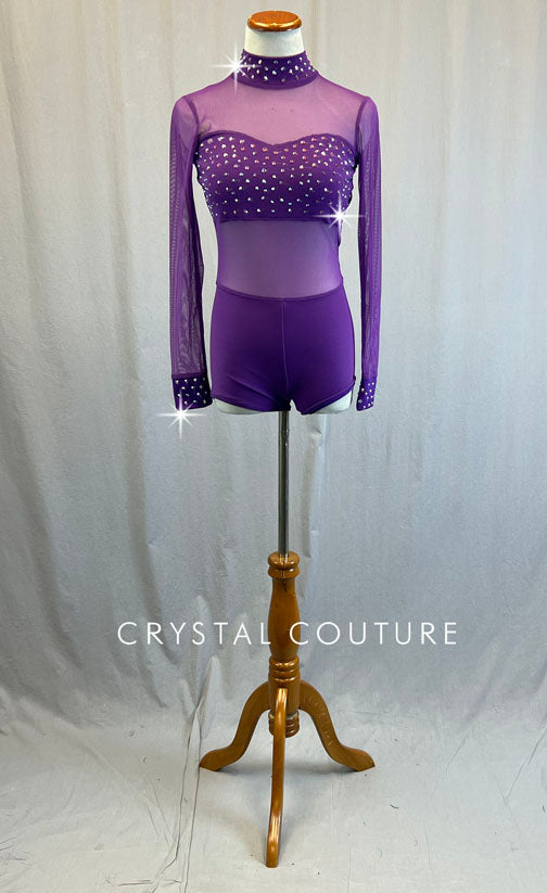 Purple Mesh Long Sleeve Leotard - Rhinestones