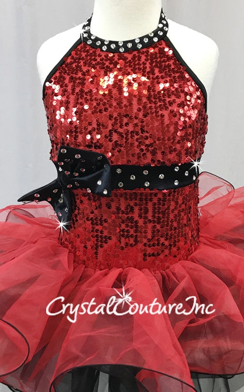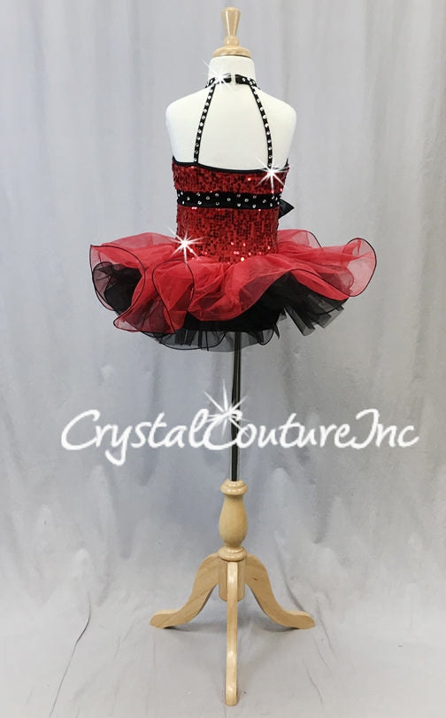 Red Sequined Dress with attached Black briefs with structured tulle Red and Black skirt, and Swarovski Crystal Rhinestones detailing around trim and Black belt.
