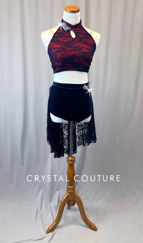 Red halter top has Navy Blue lace overlay and three horizontal straps across the back. Paired with Navy Blue velvet trunks with attached mid-length lace half skirt. Appliques on neck and left hip.